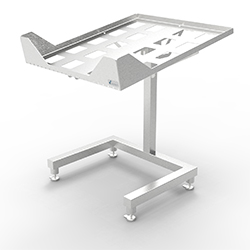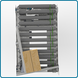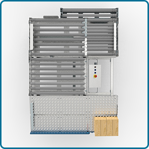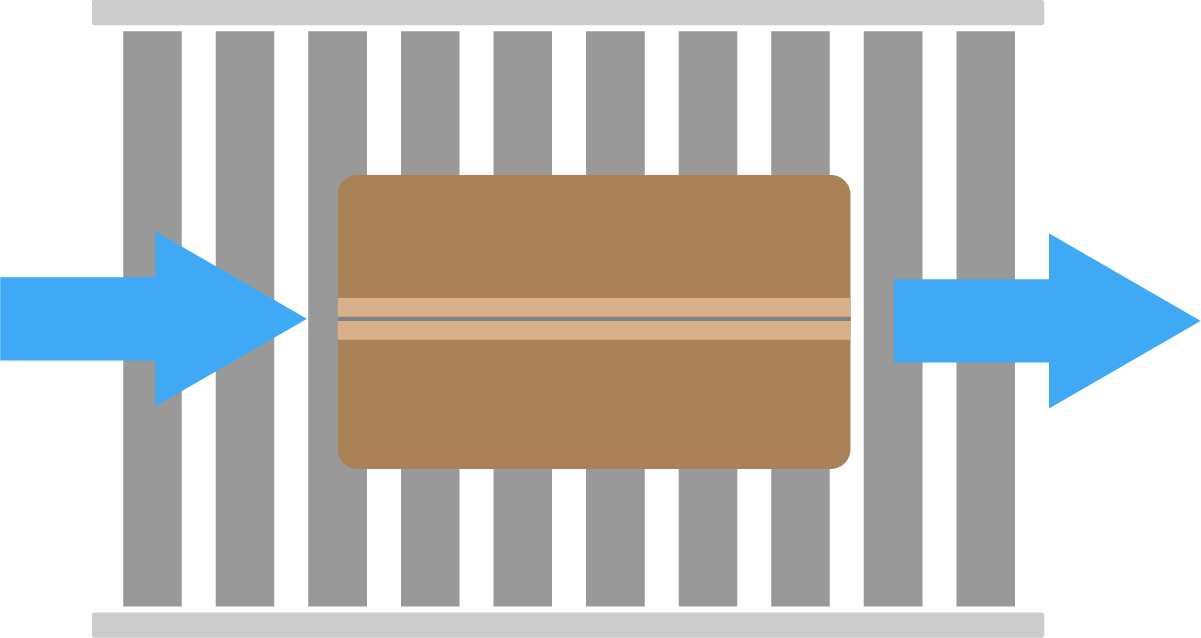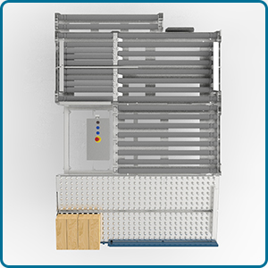 The arrow indicates the movement direction of the box. Left is the line output and right is de Smart-Palletizer setup.
